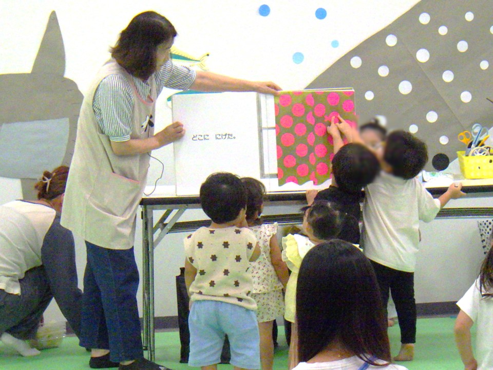 先生が絵本の金魚ごと逃げると、皆でわちゃわちゃ探しに行くキッズ団子。